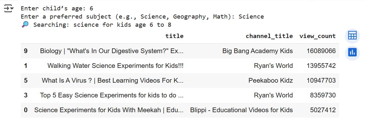 Based on Age, Interest recommend youtube channels